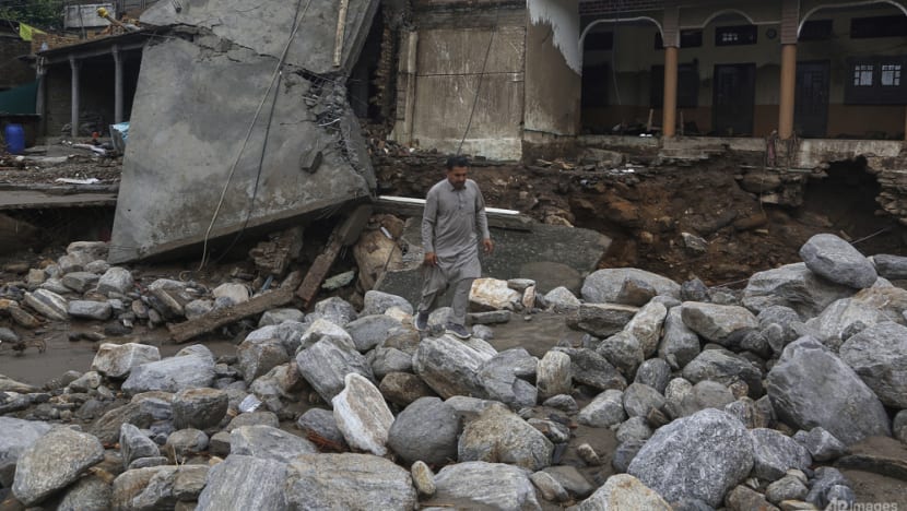 A local resident walks through rocks and rubble at damaged homes on Aug 17, 2025, after flash flooding in a neighbourhood of Pir Baba, an area of Buner district, in Pakistan’s northwest. (Photo: AP/Muhammad Sajjad)
