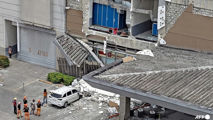 Authorities inspect a damaged wall and a car outside a mall in Butuan City, on the southern island of Mindanao on Oct 10, 2025, after a powerful earthquake struck off the southern Philippines. (Photo: AFP/Erwin MASCARINAS)