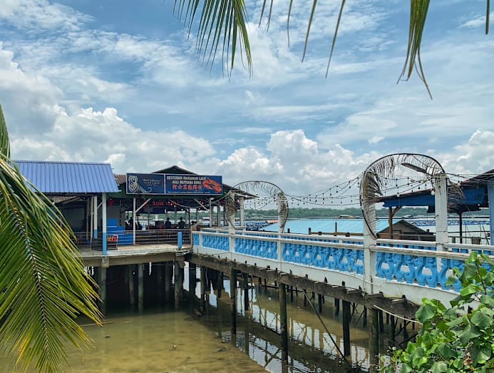 Alam Seafood Restaurant is the first you’ll come upon on the left and has the best ambience, and is airily cool on hot afternoons. The resident cats are chill as well, even with curious toddlers. Mutiara Biru, just next door, is a larger establishment sitting on concrete stilts over the water and sees larger crowds, particularly during dinnertime.