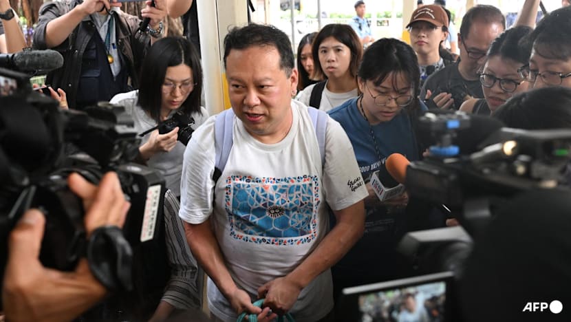 Steven Chong, a resident of Wang Fuk Court estate, talks to the media carrying items that he retrieved from his fire-damaged apartment in Hong Kong on Apr 20, 2026. (Photo: AFP/Peter Parks)