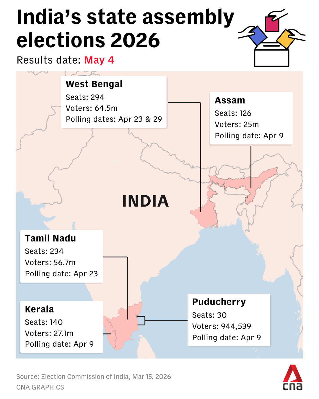 Polling in Assam, Kerala and Puducherry was held on Apr 9. Tamil Nadu votes on Apr 23, while West Bengal votes in two phases on Apr 23 and Apr 29. Results for all five regions will be declared on May 4.