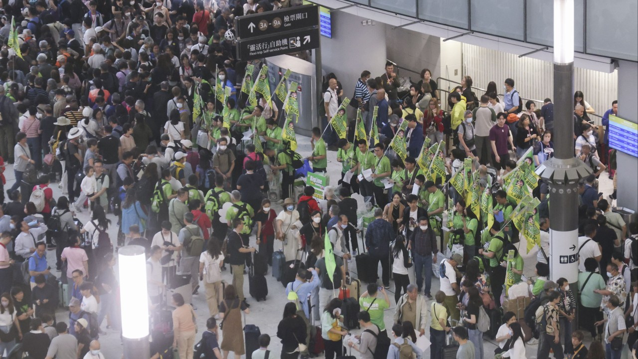 At the West Kowloon high-speed railway station, a crowd of thousands filled the departure gates at 9.30am, occupying over half of the hall fenced off for the winding queue.