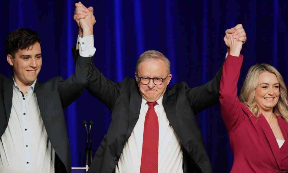 Australian Prime Minister Albanese (centre) celebrates his election victory with his partner and son. (© picture alliance/ASSOCIATED PRESS/Rick Rycroft)