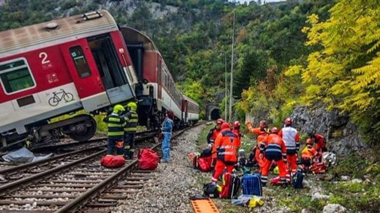 Police footage on social media showed mangled wreckage, and a locomotive and a carriage that had come off the tracks lying on the side of a hill following the crash, which happened just after 10am local time.