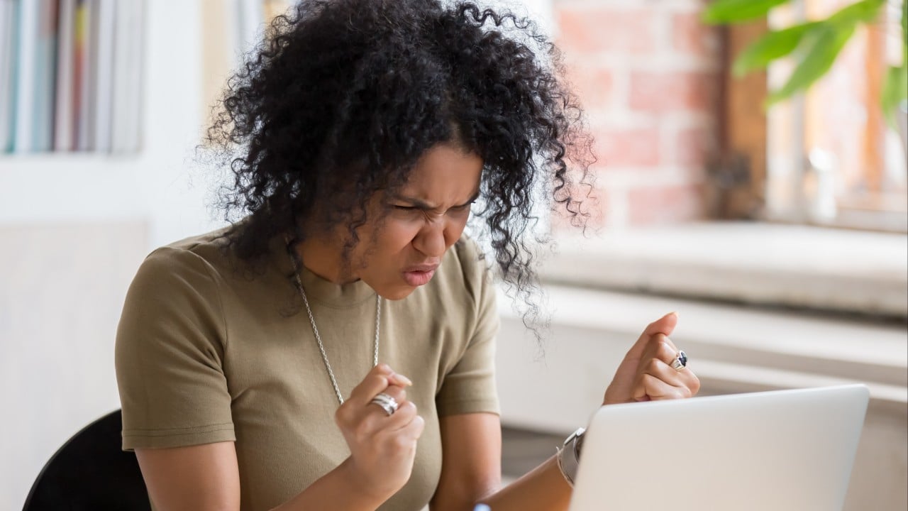 A woman angrily gestures at her laptop, highlighting the negativity of social media, where “rage bait” has become widespread. Photo: Shutterstock