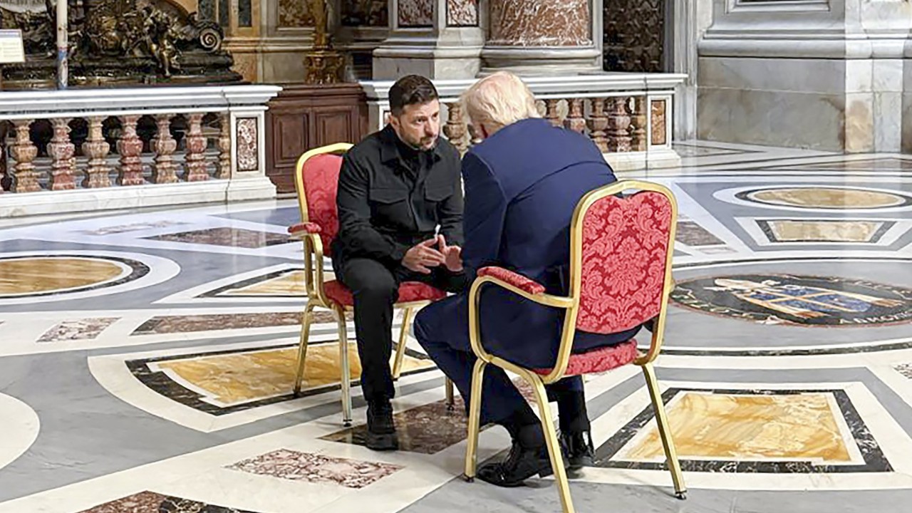 The Ukrainian presidency released photos of Trump and Zelensky sitting face to face, leaning forward in deep discussion in a corner of the basilica, as the pope’s simple wooden coffin lay in front of the altar before the funeral began.