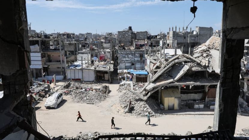 Palestinians walk near the rubble of houses in Khan Younis, in the southern Gaza Strip, Mar 27, 2025. (Photo: Reuters/Ramadan Abed)