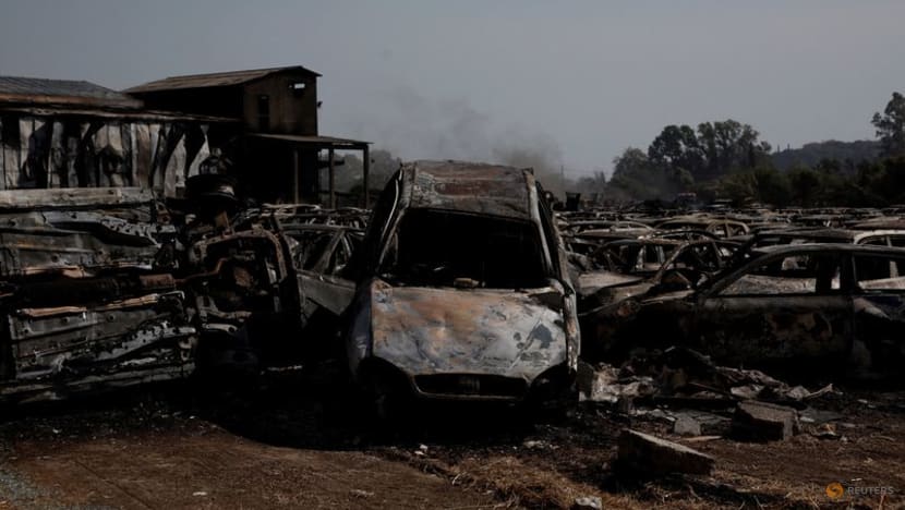 Burnt cars lie on the ground following a wildfire in Dymi, near Patras, Greece, on Aug 13, 2025. (Photo: REUTERS/Louiza Vradi)
